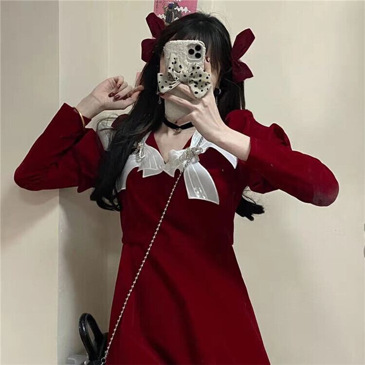 気質 レッド 新年 短いスタイル 小さい新鮮な 百掛け ワンピース