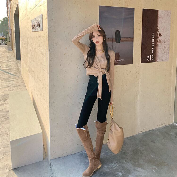 交差する フォールド バンディング Vネック 長袖 ニット 秋 冬 新作 スリムフィット