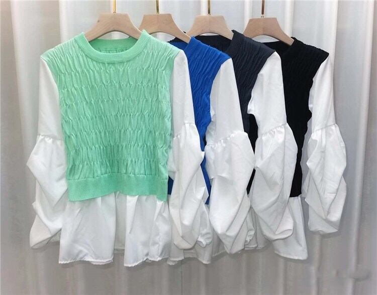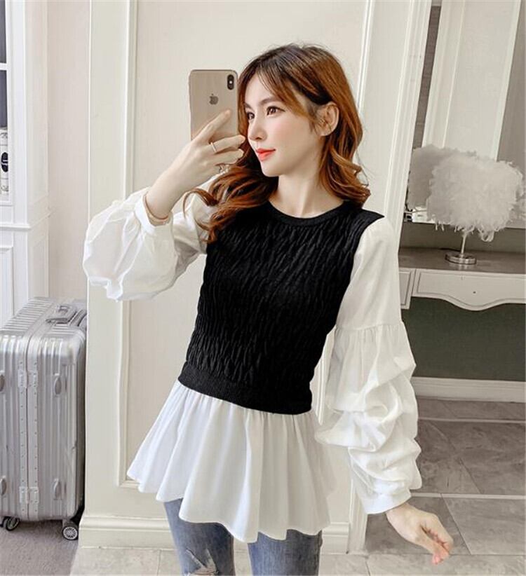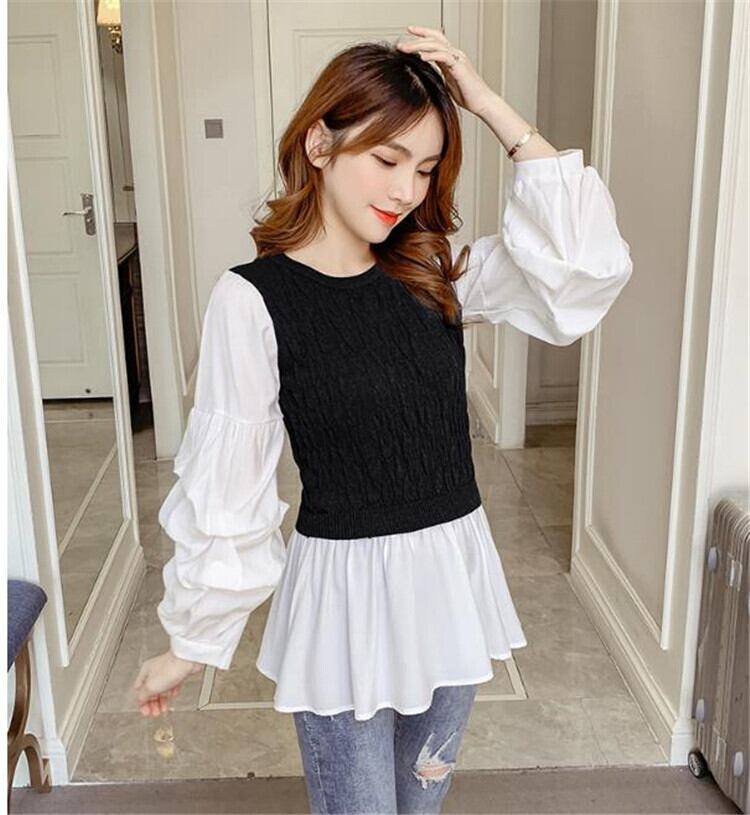 新スタイル 韓国版 フェイク2ピース シャツ 女性 スリム ランタンスリーブ 長袖 百掛け