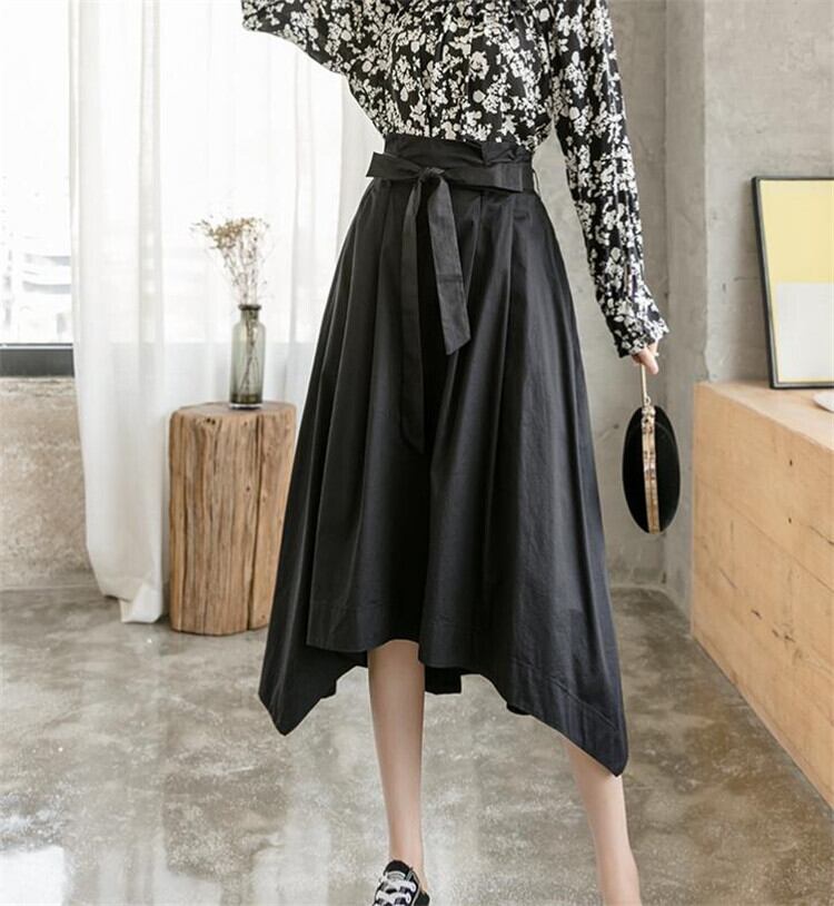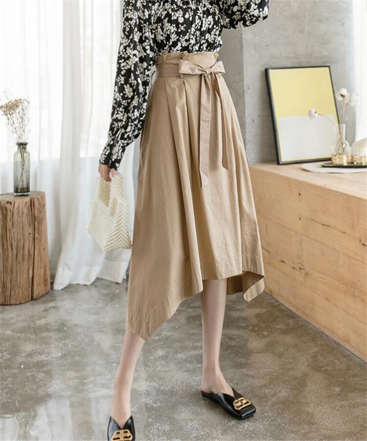 ピュアカラー 中・長セクション イレギュラー ロングスカート 薄手 蝶結び ベルト
