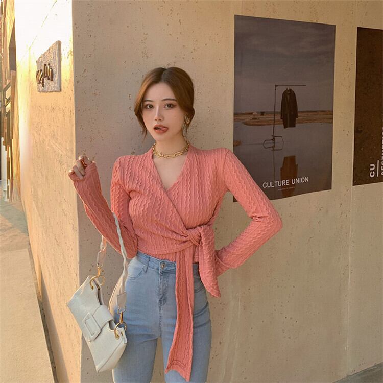 交差する Vネック 長袖 ニット レディース 秋 冬 ニュースタイル スリムフィット 百掛け 短いスタイル